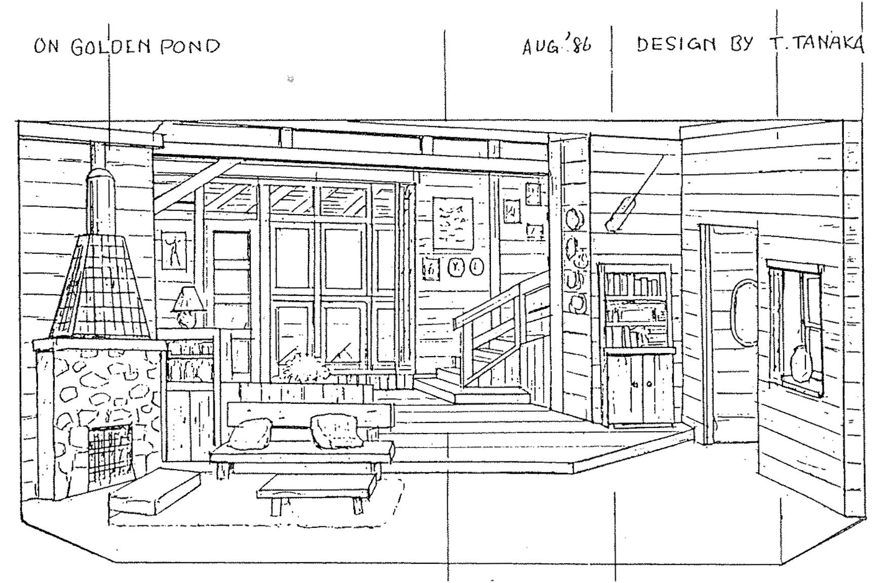 ところでこの<道具帳>と言う言葉を現在も、あのハイテク・メディアのテレビのスタジオで当事者仲間では使っています。開局当初なら新しい仕事でも、かかわりのある多くの人が古いメディア出身ばかりなのでそうなのかと思われたのですが、映画セットの場合もきっと製作仲間、セット仲間の大道具係との間の共通用語としてセット・プランとかセット・デザインとかスケッチなどと言うより<道具帳>の方が互いに通じあえたので代る言葉がないまま使っているにちがいありません。因みに道具帳というのは江戸時代中期、歌舞伎小屋で大道具を建てこんだ(註2)狂言がはじまってからの言葉で、(大道具帳)の略で、(小道具附帳>や<衣裳附帳>などと共に狂言方(註3)が二ツ折の半紙に書き出したもので大道具帳の場合は毛筆で墨一他の線描きです。色彩や細部は欄外に文言で指定してあり、各場面ごとに書き出して綴じたものです。現在はケント紙やデザイン・ボードなどに三〇分の一とか四〇分の一とかの縮尺で描きますが(図2)、それを大道具帳、略して道具帳と言っているわけです。