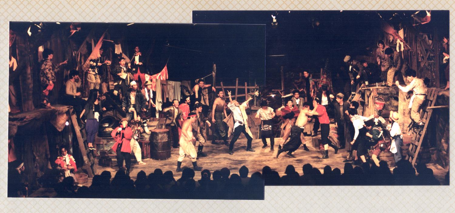 どうせなら観客もアパッチ集落の一員として感じてもらおうと、その長屋を客席両脇に延長しました。集落の中にうどん屋とか飲み屋とかあって、その場面でセリフや出番のない役者の人たちや舞台のスタッフがその屋台の中で呑んで食って、舞台真ん中で起こっている芝居を見ているんですよ。とても面白かったです。
