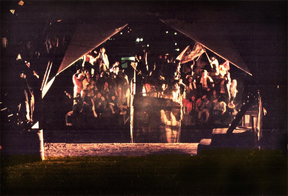 加藤:そして最後に…実は舞台装置はトラック 2 台を両端に置いて、その荷台と、その間にキャスター付きのイントレを渡してその上に部落のセットを作ってたんですね。ラストシーンで、機動隊に集落を潰されて住人達が散り散りに逃げていくんですけど、実際テントの奥を開いて、トラックとその上に載せられた部落のセットが遠くに去っていく…という仕掛けをしました。