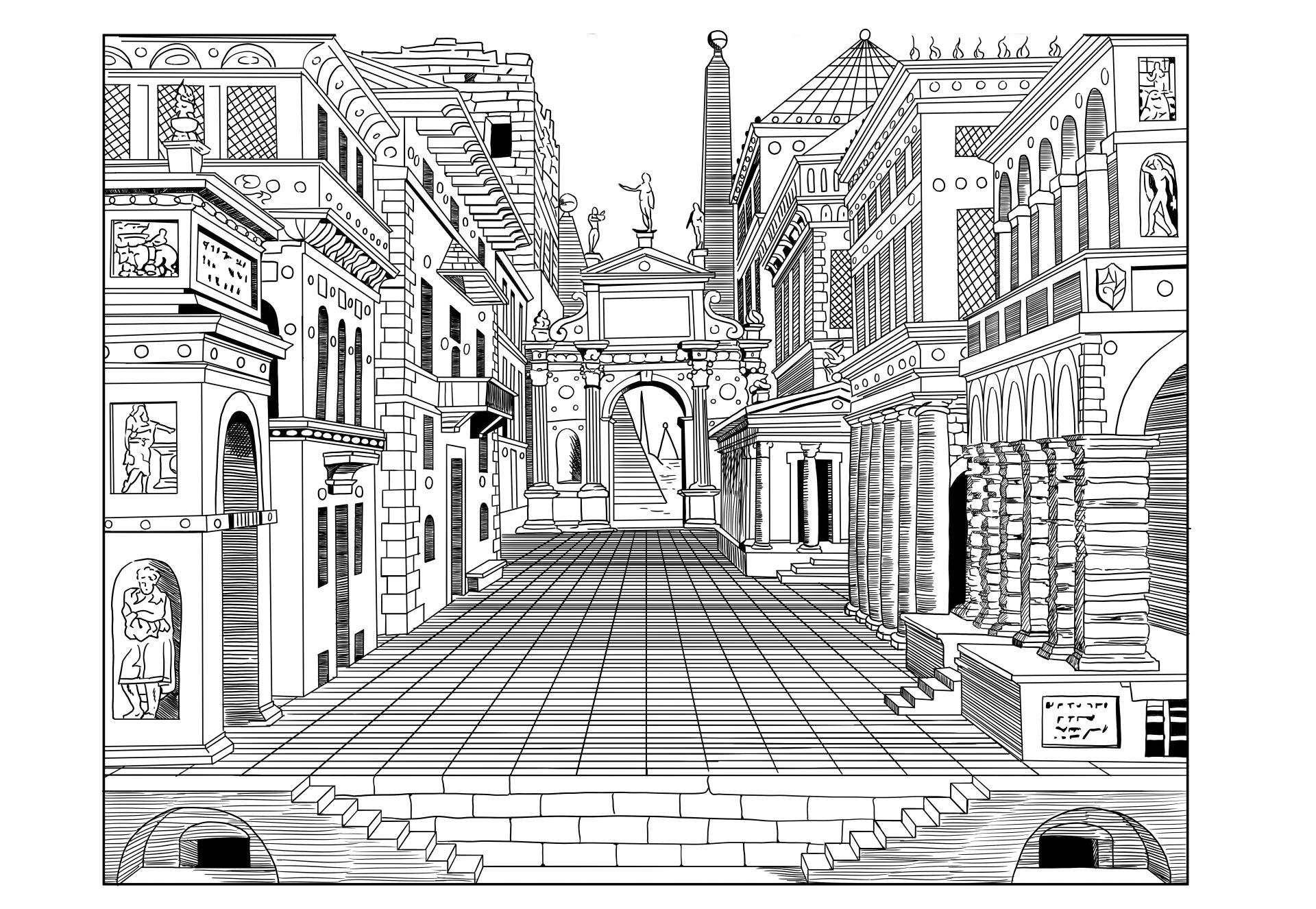 ( 図 1) セルリョ<透視画の法則>による悲劇の装置 (1545 年)(複製図 日本舞台美術家協会)