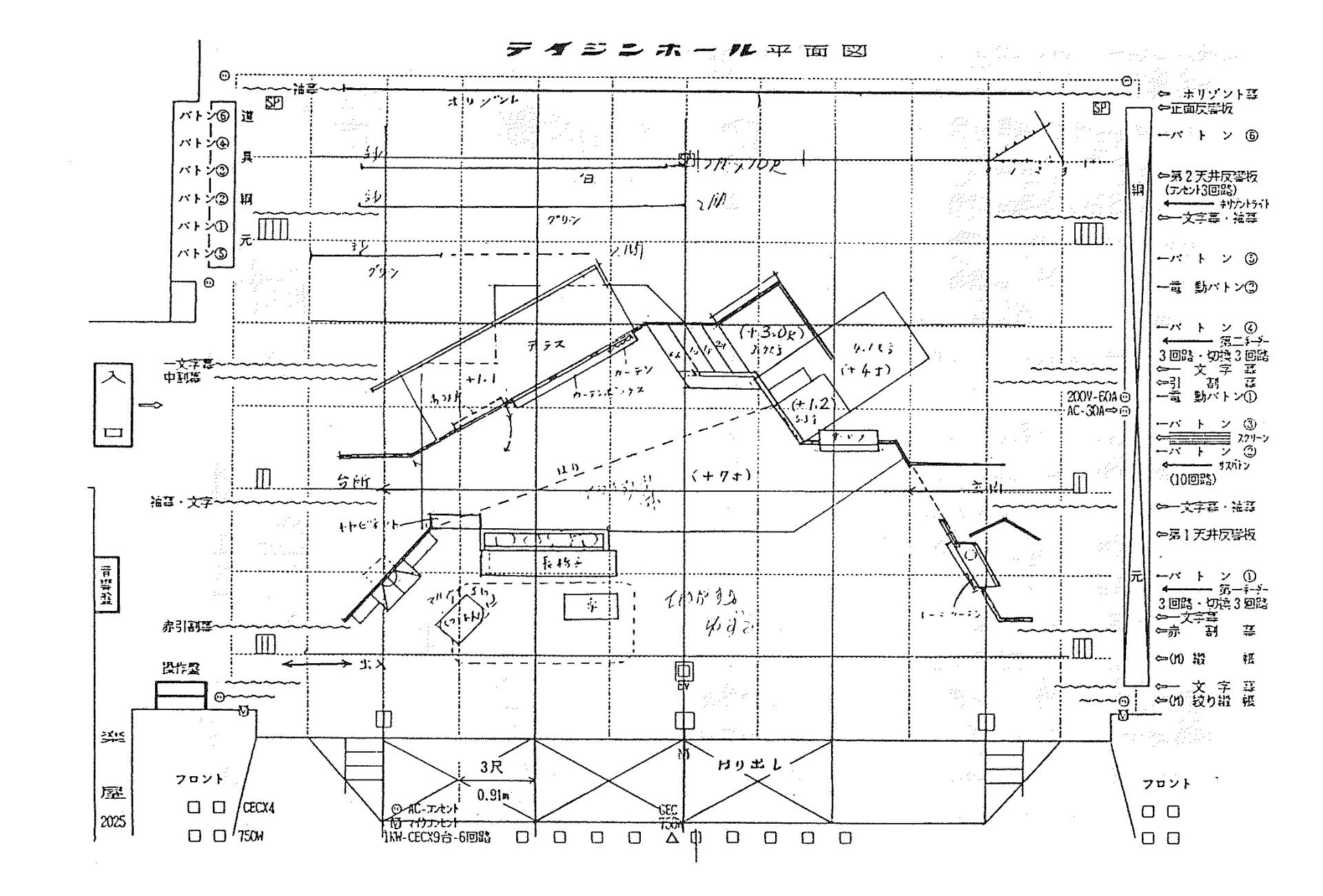 公演のパンフレット(番付)には配役(キャスト)と共にスタッフの連名がのっていて、通常「原作者/脚色者/演出者」につづいて「装置・何某/衣装・何某/照明・何某/音響効果・何某……」となっています。これに関して、ある時、若い大道具係に突っこまれたことがあります。"装置をしているのはわれわれ大道具方であって、ここにある装置の何某という人は道具帳を描いただけではないか"と、<道具帳>という言葉がとび出してハッとしました。そうだこのパンフにある装置というのは装置デザインもしくはセットプランであって、舞台の上にセットしているのは大道具方であって名も無き作業員だったのだと。その意味では<Sconography>は正に古くからの幕内言葉の<道具帳>なのです。