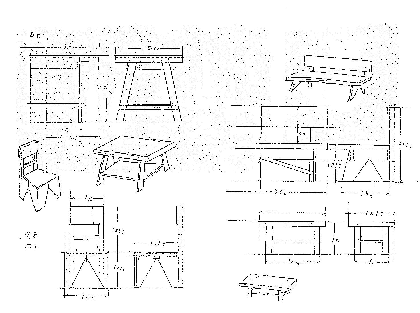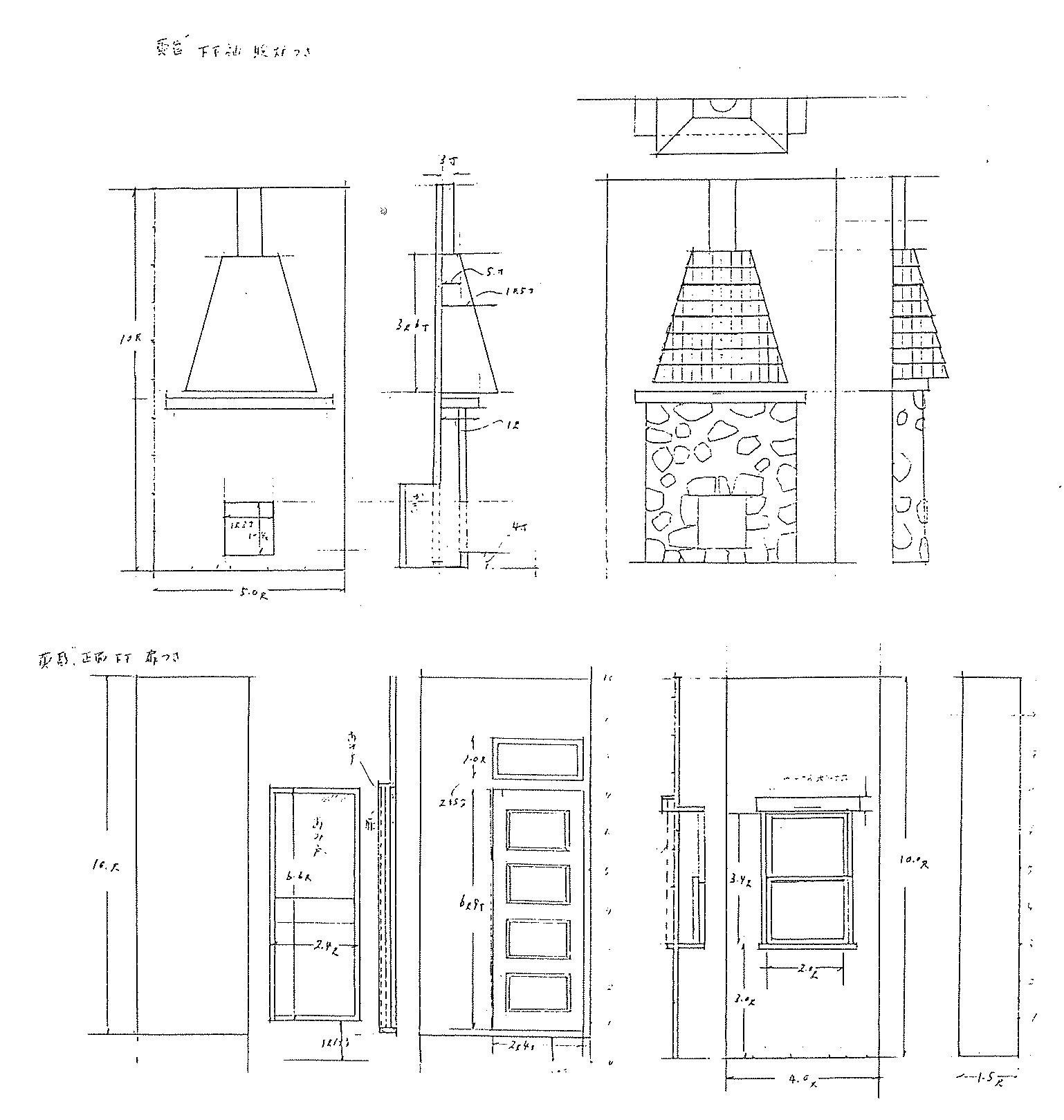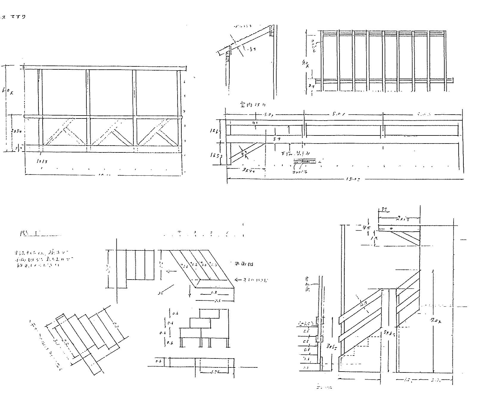 道具帳は彩色されますが、大道具製作のための単なる図面ではなく、情景のイメージとかヴィジョンとして、演出スタッフは勿論、出演者がこの画面を予め見て知ることによって、自分がどこから登場し、どこに位置するかなどアクションのイメージづくりに役立てます。大道具係に渡す時にはこれに平面図や製作図面・分解図(図3)が必ず添えられますが、これらの図面によって工作され、背景師が塗装揮毫して製作完了というわけです。こうして出来た大道具のパーツはホールの舞台に搬入され、パーツはつながれ、吊りこまれ、組み立てられ、平面図によってセットされます。それから道具しらべがあって舞台稽古が始まるというわけです。こうして見ると道具帳を描く仕事と、道具をセットする仕事とはつながっていながらはっきり別であることが判ります。