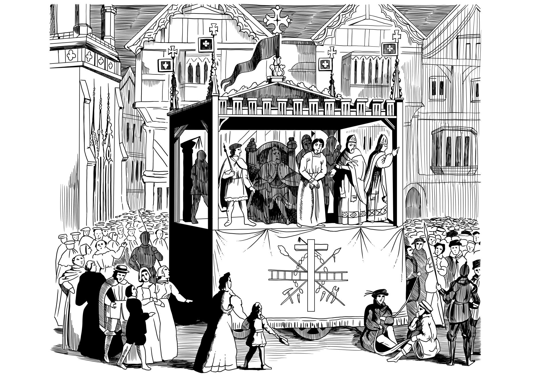 (図 2)中世ヨーロッパの移動劇場 (複製図 日本舞台美術家協会)