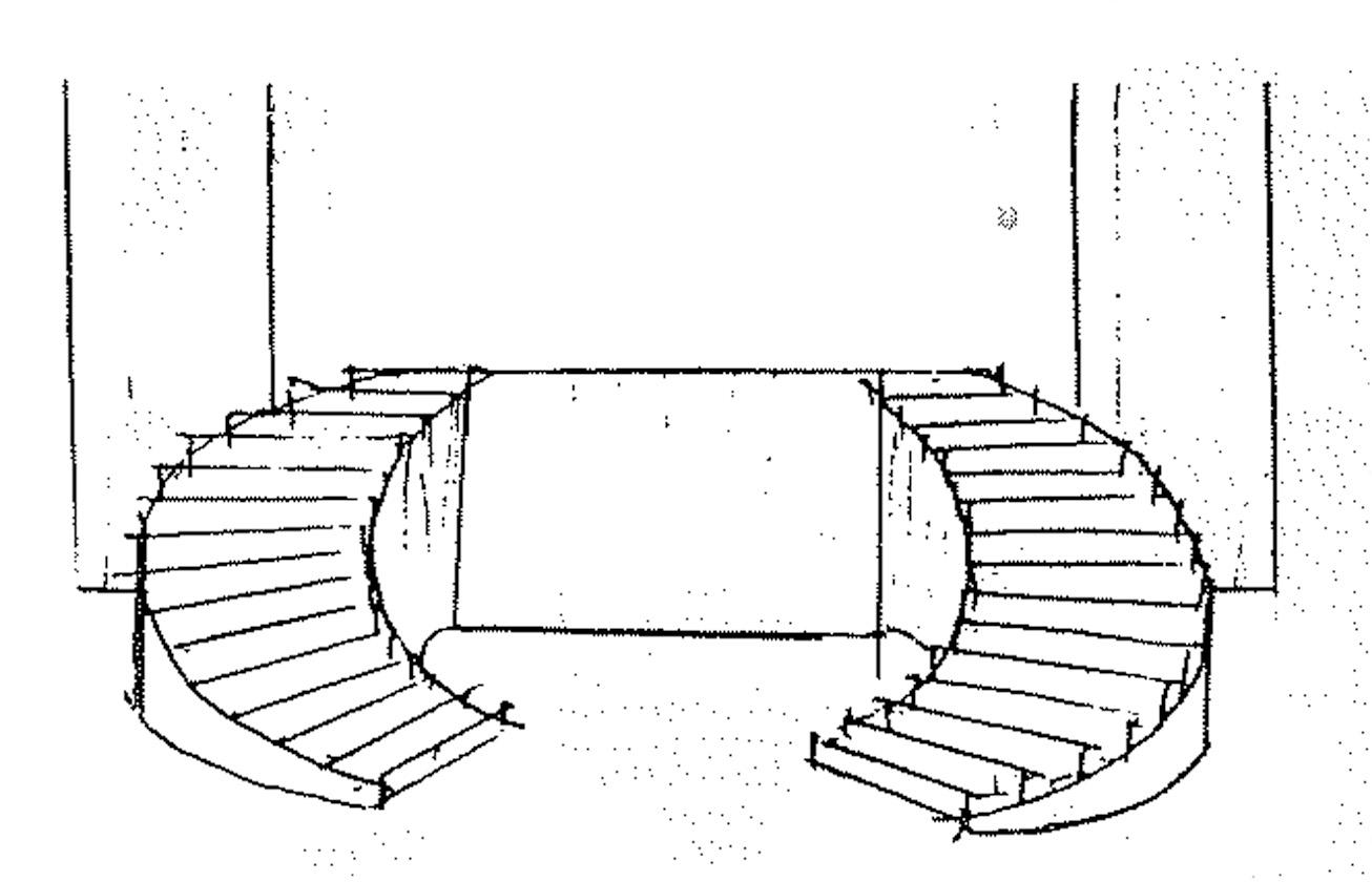 無論転換時間も短縮され、今やこの装置は定番となり、どんな演目の時でもフィナーレはこれと決ってしまいました。もともとはこの様にどの公演にも画一的ではなく、演目によりフィナーレの階段は毎回ちがっていて、前公演で使用済みは避けて、新奇のデザインを案出していました。正面向きと限らず斜め階段、湾曲した階段、ジクザク、馬蹄型(図7・8)さまざまで装置家も演出家も新趣向に苦労していました。そんな点でも現在このように一定にした英断にはひとつの時代が考えられるし、それがかえって名物にさえなろうとは予想もしてなかったにちがいありません。