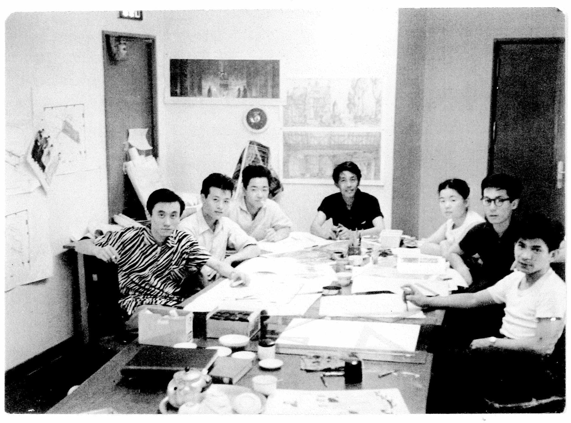 1986年6月「イタリア歌劇団来日公演」を日本の劇場にあうように改 訂した。NHKの一室を舞台美術デザイン室にして、交替に仮眠をとるような過酷な連日だった。チーフの 河童さんは縞柄のアロハシャツ。緒方規矩子(右から3人目)がアシスタントとして参加した。