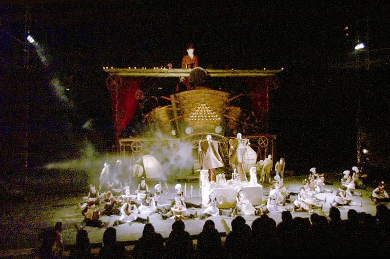 柴田:そうですね。維新派の台本読んでもイメージがつかみにくくて。なんかこう…暗号みたいな、役者のA.B.C.がグリッドに配置されていて、どこどこでこういう動きの振り付けがついて、振り付け担当の劇団員がいつもリズムを取りながら練習してました。あと音楽のリズムだけが決まっていて、このリズムでこの動きでっていうのも、同時進行で作品とは別に進んでました。その断片的に出来上がって来るものを松本さんがつなぎ合わせていく…ということをされていたように思います。