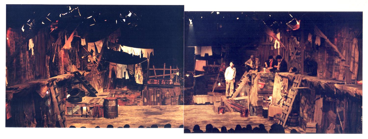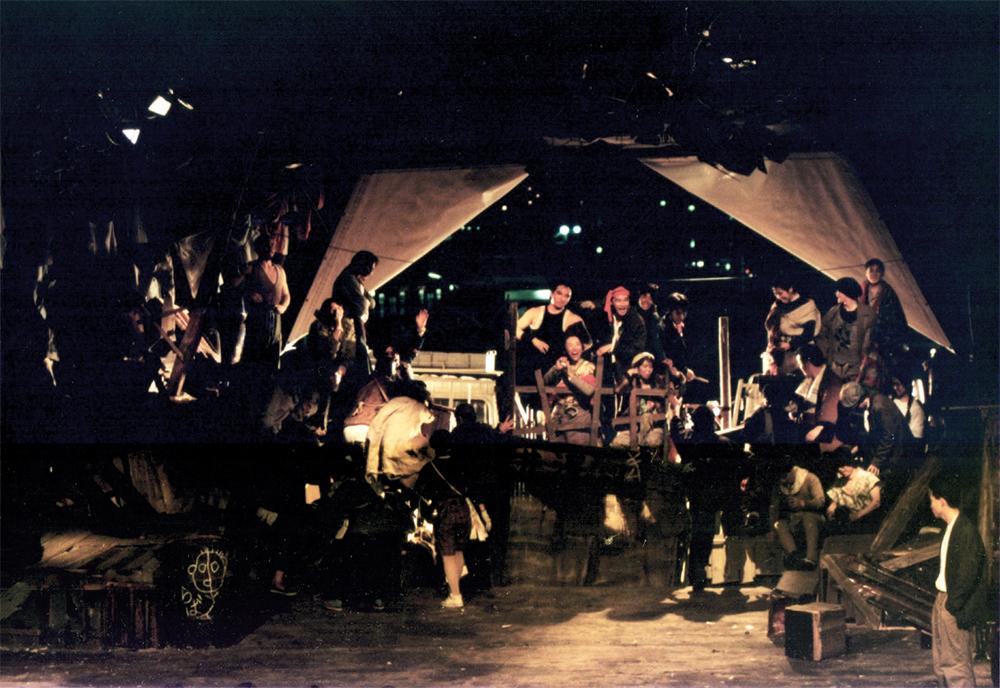 どうせなら観客もアパッチ集落の一員として感じてもらおうと、その長屋を客席両脇に延長しました。集落の中にうどん屋とか飲み屋とかあって、その場面でセリフや出番のない役者の人たちや舞台のスタッフがその屋台の中で呑んで食って、舞台真ん中で起こっている芝居を見ているんですよ。とても面白かったです。