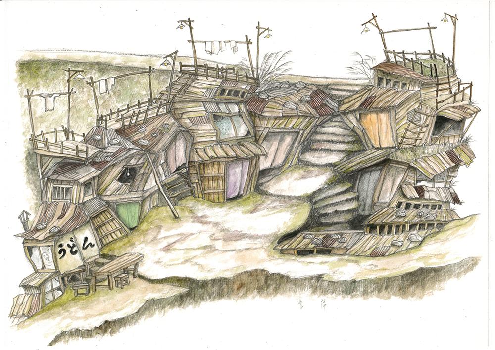 小説には瘡蓋のような家、古帯の様な緑色の苔むした湿気の高い道が…という描写があったので、装置はその辺で落ちてるものを拾ってきてくっつけ合わした様なもので、すごくリアリティーのあるものが出来ました。でも、拾い物ばかりで基礎以外はすごくお金もかからず(笑)。