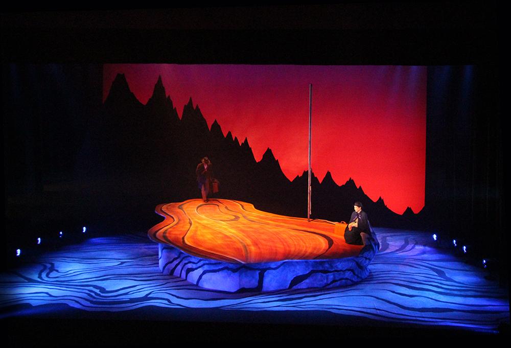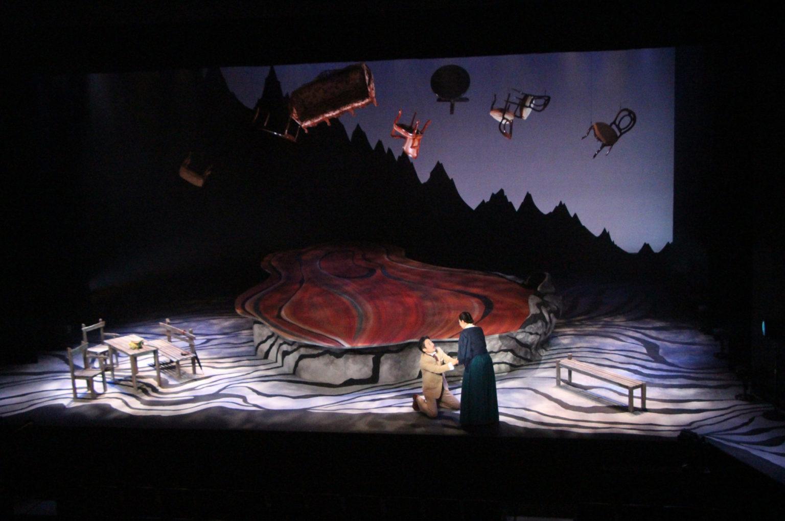 二場—湖の岸辺。空中に浮かんだ一場の家具がダイナミックな構図を創る。
